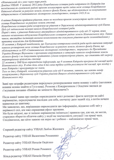 Заявление подписали старший редактор сайта Любовь Жаловага, редакторы сайта Валентина Романенко, Наталья Овдиенко, Роман Романюк, Наталья Негрей.