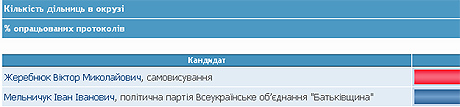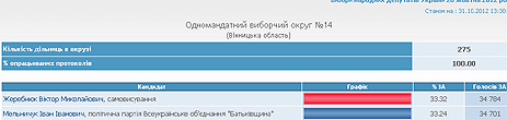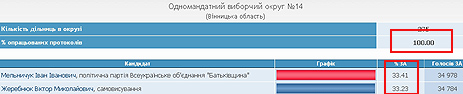 Так еще утром после обработки 100% протоколов кандидат от Батькивщины Иван Мельничук получил 33,41% , а его оппонент самовыдвиженец Виктор Жеребнюк - 33,21%. Разрыв составлял 194 голоса.