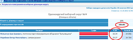 Теперь по новым данным Мельничук получил 33,34%, а Жеребнюк - 33,27%. Разрыв между оппонентами, по новым данным, составляет всего 72 голоса, что меньше первой суммы в более 2 раз.