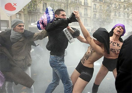 По данным пресс-службы активисток, инцидент произошел во время топлес-протеста Femen "In Gay we trust" в поддержку законопроекта об однополых браках во Франции.