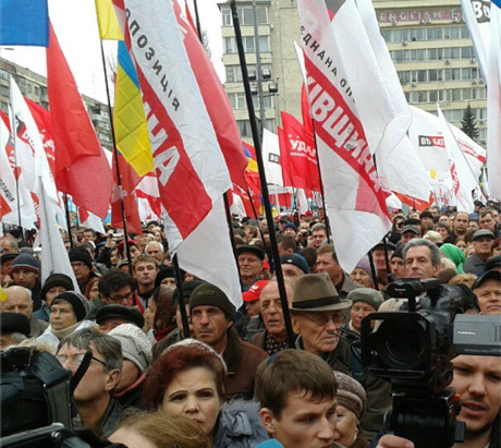 Они держат флаги своих партий и скандируют "Януковича геть!", "Бандита геть!", "Криминал", а также выкрикивают фамилии мажоритарщиков, которые победили на выборах.