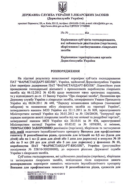 Об этом говорится в распоряжении Госслужбы лекарственных средств еще от 12 декабря 2012 года, которое "Украинской правде" предоставили в пресс-службе депутата от "Батькивщины" Андрея Сенченко.