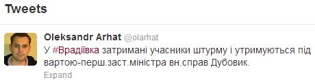 Ранее Александр Аргат написал в Twitter, ссылаясь на первого заместителя министра внутренних дел Виктора Дубовика, что во Врадиевке задержаны участники штурма и их содержат под стражей.