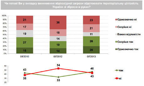 Вместе с тем, 43% опрошенных не готовы отстаивать территориальную целостность Украины с оружием в руках, 11% - не определились.