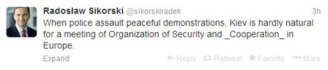 "Когда правоохранители напали на мирную акцию, Киев - вряд ли соответствующее место для встречи ОБСЕ", - написал главный польский дипломат.
