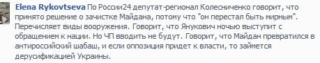Также российская журналстка Елена Рыковцева сообщила у себя в Фейсбук, что по "России24" депутат-регионал Колесниченко сказал, что принято решение о зачистке Майдана, потому что "он перестал быть мирным".