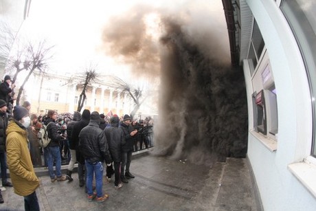 В стены и двери милицейского управления со стороны Театральной люди в масках бросали самодельные гранаты. От удара взрывной волны вылетели стекла входных дверей.