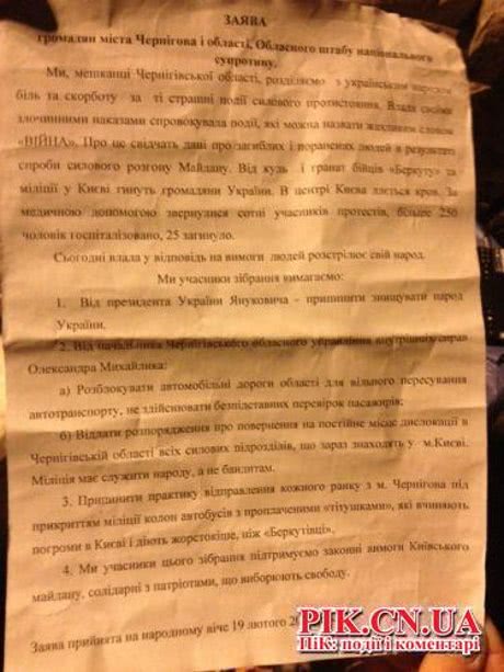 Переговорщикам Михайлык пообещал, что трасса Киев-Чернигов блокироваться не будет, ни один черниговский милиционер не будет отправлен в Киев, а 20 февраля Михайлык будет связываться с руководством насчет того, чтобы черниговский "Беркут" вернулся из Киева.