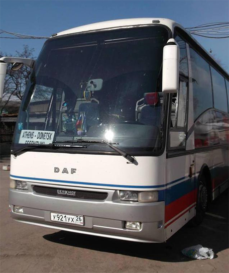 "Вот на таких автобусах свозили руститушек в Донецк, которые сегодня убивали людей во время проведения антивоенного митинга. Автобус прибыл 13-го марта по адресу улица Гаражная, 1. Организатор поездки фирма " Волга-травел". Официальный маршрут Ессентуки – Афины", - написал он.