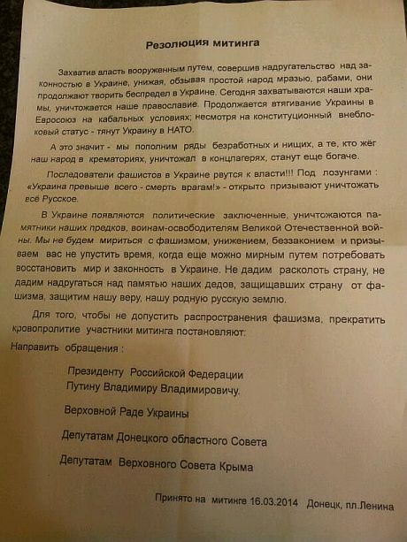 "Мы не будем мириться с фашизмом, унижением, беззаконием, и призываем вас не упустить время, когда еще можно мирным путем потребовать восстановить мир и законность в Украине. Не дадим расколоть страну, не дадим надругаться над памятью наших дедов, защищавших страну от фашизма, защитим нашу веру, нащу родную русскую землю", - написано в резолюции.
