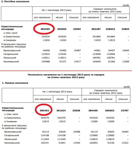 Однако по состоянию на 1 ноября 2013 года, согласно данным Управления статистики в Севастополе, все постоянное население города – 383 499 человек, а присутствующее на тот момент – 385 462 человек.