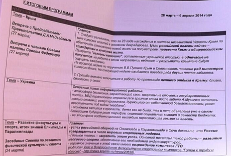 Кроме того, российские журналисты должны рассказывать о "разгуле криминала" в Украине, а также "нарастающей грызне за власть".