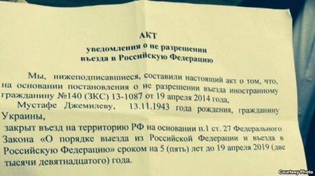 "Мы, нижеподписавшиеся, составили настоящий акт о том, что, на основании постановления о неразрешении въезда иностранному гражданину №140 (ЗКС) 13-1087 от 19 апреля 2014 года, Мустафе Джемилеву 13.11.1943 года рождения, гражданину Украины, закрыт въезд на территорию РФ на основании п.1. ст. 27 Федерального закона "О порядке выезда из Российской Федерации и въезда в Российскую Федерацию" сроком на 5 (пять) лет до 19 апреля 2019 года", – говорится в указанном акте.