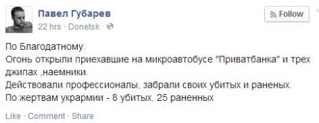 "Губарев, который, кажется, не имеет большого влияния на сепаратистские группировки, появился на российском телевидении и обвинил украинских националистов из "Правоого сектора" в нападении на украинских солдат, потому что они отказались нападать на мирное население", - пишет газета.