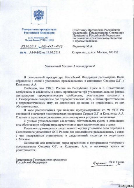 Оснований для изменения меры пресечения и прекращения уголовного преследования Олега Сенцова и Александра Кольченко, задержанных в Крыму, не усматривается.