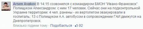 Как написал в Facebook министр МВД Арсен Аваков, около 14 часов из окружения вырвался также комбат батальона "Ивано-Франковск" и 17 его бойцов. 4 из них - ранены.