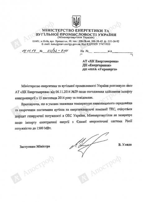 "Учитывая то, что в условиях снижения температуры внешней среды и сокращения поставок угля на энергогенерирующие компании ТЭС, ожидается дефицит генерирующих мощностей в объединенной энергосистеме Украины, Минэнергоугля не против импорта электрической энергии из Единой энергетической системы России мощностью до 1500 МВт",‒ говорится в письме, подписанном заместителем министра Вадимом Улидой.