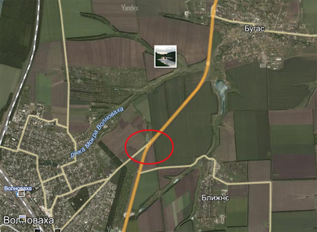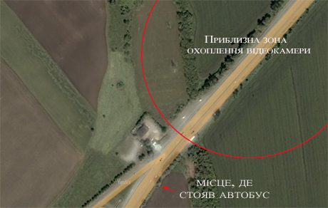 Автобус, в который попал снаряд, находится за камерой. На видео справа от трассы можно увидеть тень от взрыва после попадания снаряда недалеко от автобуса.