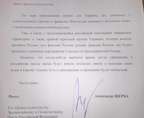 "Посольство планирует возложить венки к памятникам воинам-освободителям. Увы, в связи с продолжающейся российской оккупацией украинской территории, а также прямой агрессией против Украины, которая ведется оружием России, под флагами России, руками граждан России, мы будем проводить памятные мероприятия отдельно от представителей России", - отмечает Щерба в письме на имя посла РФ.