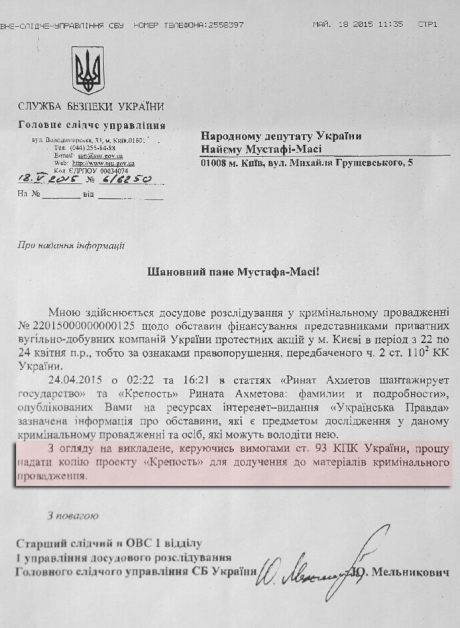 Служба безопасности официально запросила материалы секретного плана "Крепость" компании ДТЭК Рината Ахметова у депутата фракции "Блок Петра Порошенко" Мустафы Найема.
