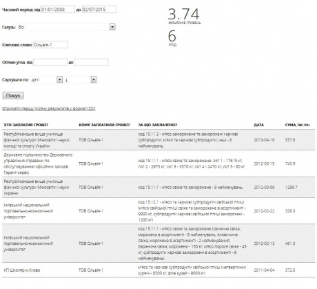 В апреле 2014 года, уже после смены власти в Украине, "Ольвія-1" заключила 2 соглашения на поставки мяса общей стоимостью почти 560 тысяч гривен: с Республиканским высшим училищем физкультуры Минобразования и с ГП ГУД "Гарант-сервис".