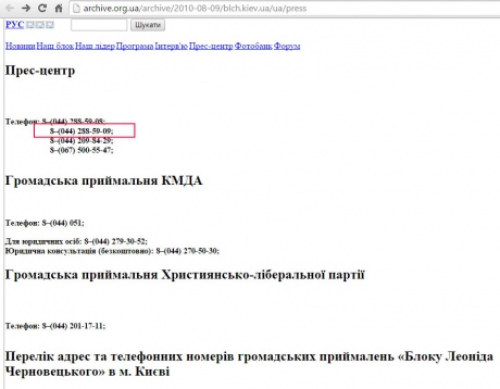 По этому номеру поиск также выдает архивную страницу Блока Леонида Черновецкого, а телефон указан среди номеров пресс-службы блока.