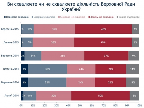 Деятельность Верховной Рады одобряют лишь около 11%, а 81% – не одобряет. Показатель недоверия к парламенту пока один из пиковых за последние полтора года. Прошлой весной Раду поддерживали 39% украинцев, не поддерживали – 50%.