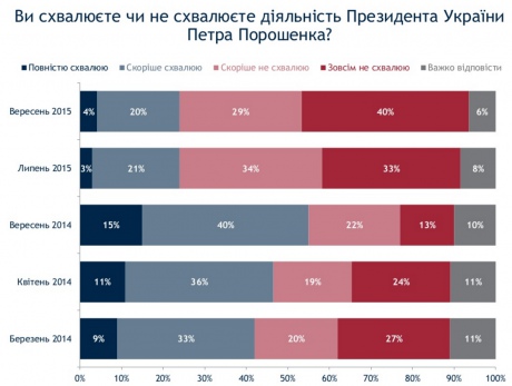 Деятельность президента поддерживают 24%, не поддерживают – 69%, что является пиком недоверия к нему за все время. Вершина популярности Петра Порошенко была в прошлом сентябре, когда его деятельность одобряли 55% украинцев, не одобряли – 35%.