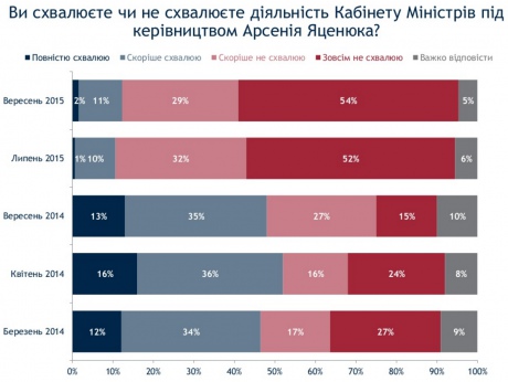 Работу Кабмина поддерживают 13%, не поддерживают – 83%. Этот показатель немного улучшился с июля, когда сторонников правительства было 11%, противников – 84%. Пик популярности Кабмина был в апреле 2014 года, когда его поддерживали 52%, не поддерживали – 40%.