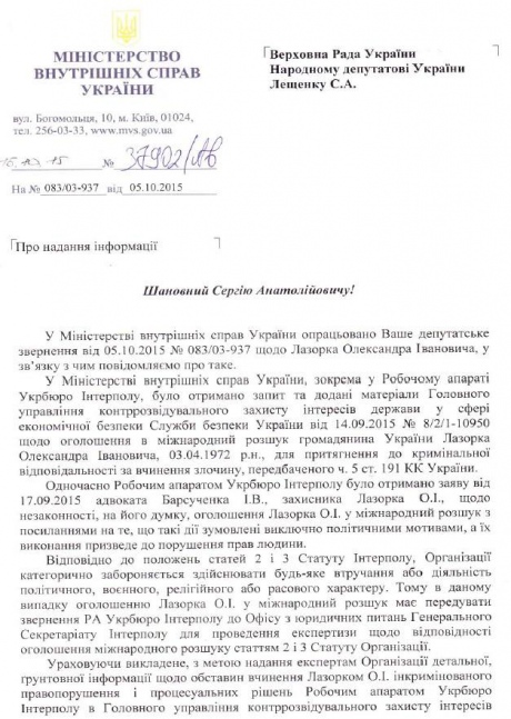 "Рабочим аппаратом Укрбюро Интерпола было получено заявление от адвоката Барсученко, защитника Лазорко, о незаконности, по его мнению, объявления Лазорко в международный розыск со ссылками на то, что такие действия обусловлены исключительно политическими мотивами, а их выполнение приведет к нарушению прав человека", - говорится в ответе ведомства.