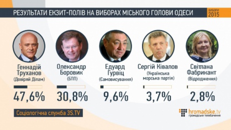 В Одессе по данным экзит-пола Студии Савика Шустера, во второй тур выходят нынешний мэр Геннадий Труханов и советник председателя областной ОГА Александр Боровик.