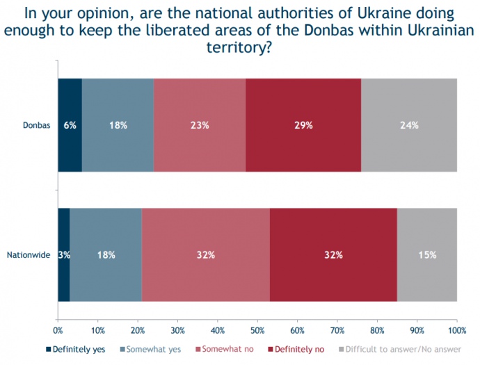В ответ на вопрос, достаточно ли власть делает для того, чтобы сохранить освобожденные районы Донбасса в составе Украины, 64% заявили, что недостаточно (половина из них в этом твердо убеждена), а 21% считает, что достаточно (из них твердое убеждение имеют лишь 3%). Остальные 15% не определились.