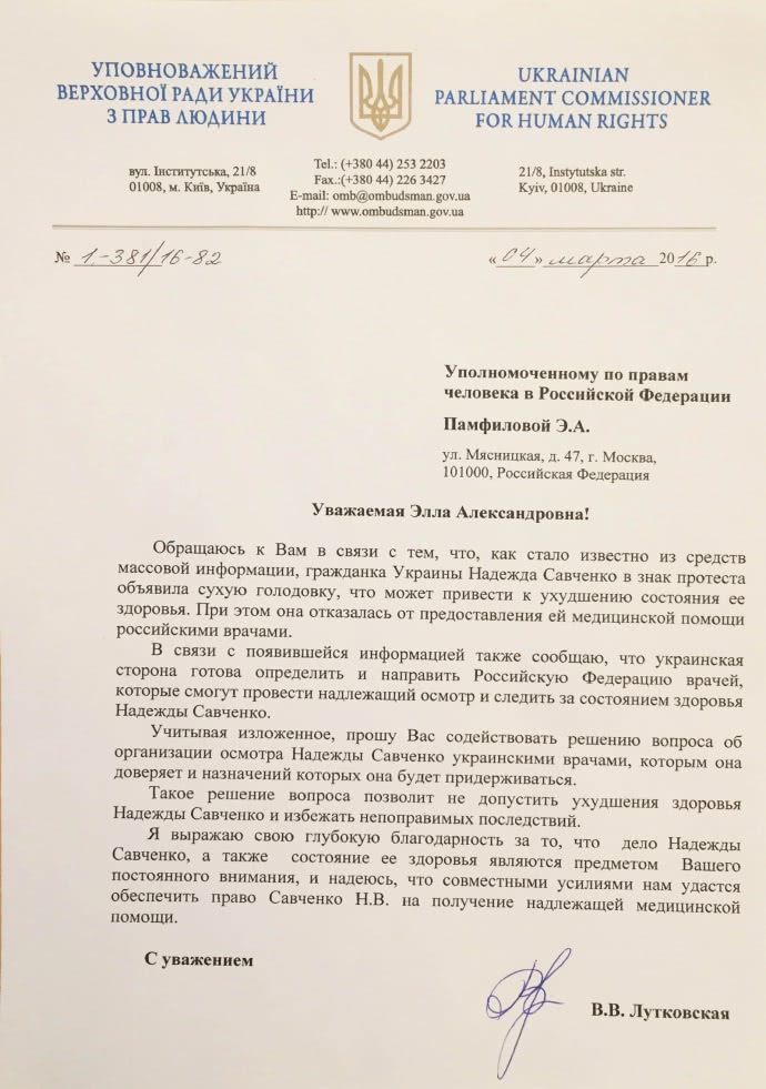 "Украинская сторона готова определить и направить в Российскую Федерацию врачей, которые смогут провести надлежащий осмотр и следить за состоянием здоровья Надежды Савченко. Прошу вас способствовать решению вопроса об организации осмотра Савченко украинскими врачами, которым она доверяет и рекомендаций которых она будет придерживаться", - говорится в письме омбудсмена.