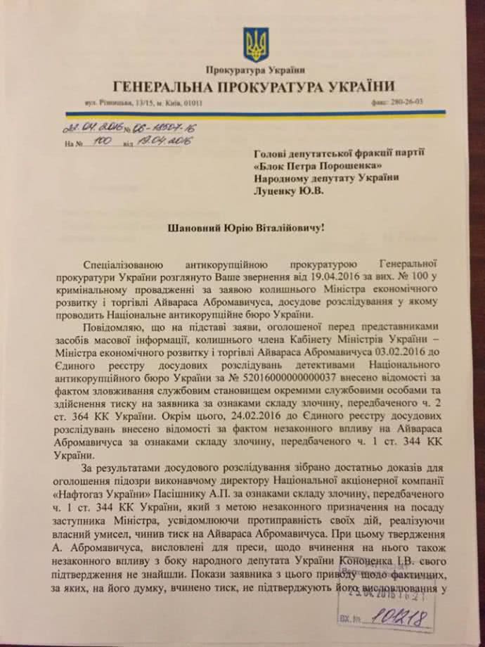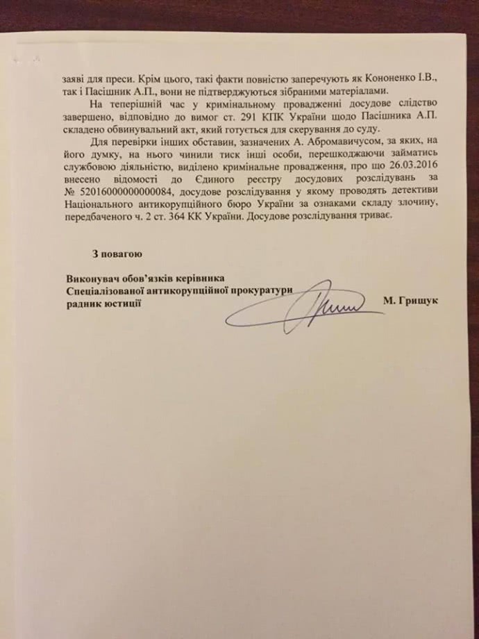 По ее словам официальным основанием для этого стал ответ Генпрокуратуры о том, что заявление бывшего министра экономического развития и торговли Айвараса Абромавичюса о давлении, которое оказывал на него Кононенко, не нашло подтверждения.