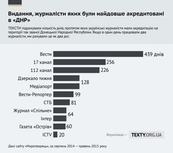 Издание Texty опубликовало статистику по украинских изданий, журналисты которых получили аккредитацию на неподконтрольной территории.