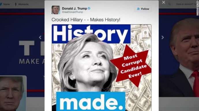 В соцсетях разразился скандал, из-за поста в twitter Дональда Трампа с изображением Хиллари Клинтон рядом со стодолларовыми купюрами и Звездой Давида и надписью "самый коррумпированный кандидат всех времен".