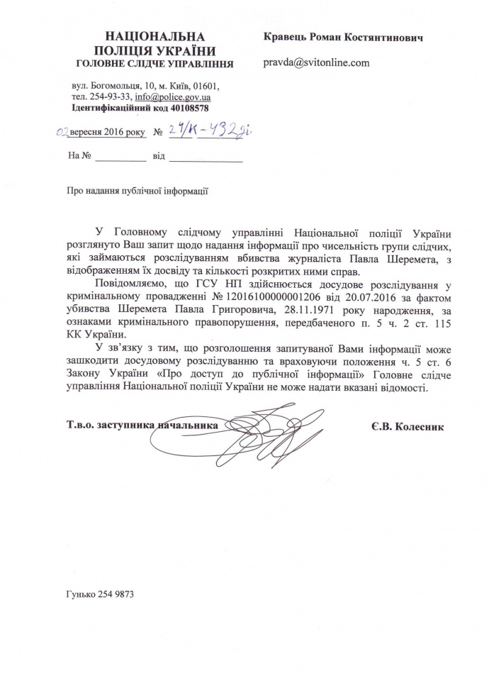 УП поинтересовалось у Нацполии тем, сколько следователей занимаются расследованием убийства журналиста и одного из руководителей УП Павла Шеремета. Таже УП интересовалась, какой опыт работы в правоохранительных органах имеют эти следователи, и есть ли на их счету успешно раскрытые дела.