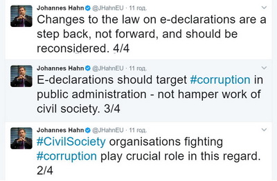 Комиссар ЕС по вопросам политики соседства и расширения Йоханнес Ган критикует внесение изменений в закон об е-декларирования.