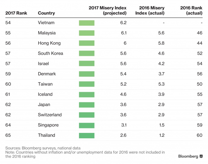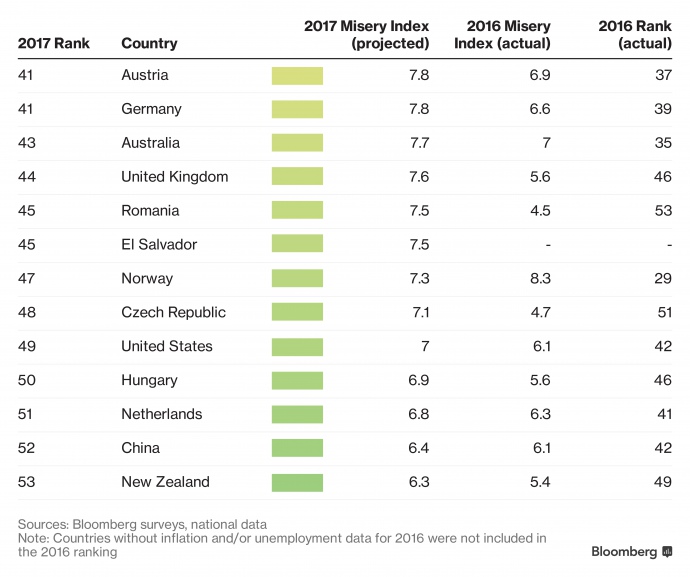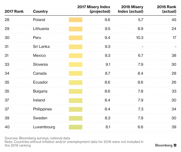 В Bloomberg's Misery Index (индекс бедности или обездоленности), который основывается на прогнозах инфляции и безработицы для 65 стран в 2017 году, Украина занимает 7 позицию с прогнозируемым индексом 19.