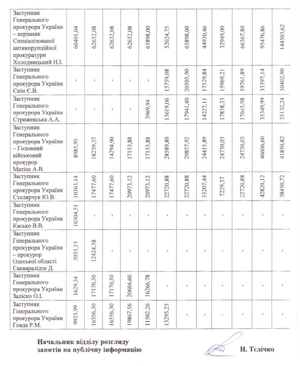 Согласно ответу на запрос УП, наибольшую премию в органах прокуратуры получил руководитель САП Назар Холодницкий. На начала 2016 году премия Холодницкого составила 60 тысяч, а уже в декабре - 144 тысячи 503,62 гривны.