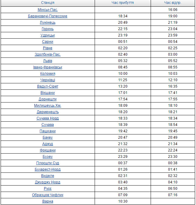 Согласно расписанию, поезд въезжает на территорию Украины из Минска через Удрицк. Из городов Украины поезд проезжает Ровно, Львов, Ивано-Франковск, Коломыю, Черновцы.