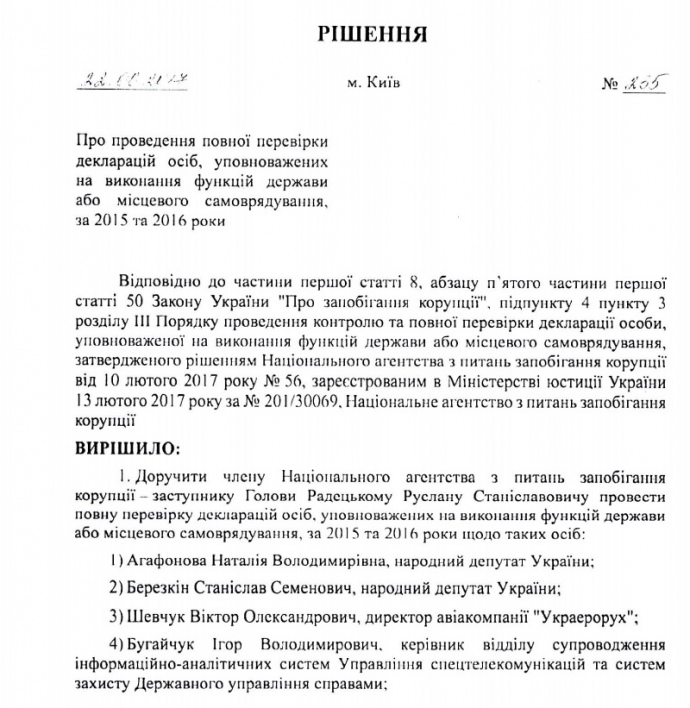 Согласно документу, такую проверку поручено провести заместителю председателя НАПК Руслану Радецкому.
