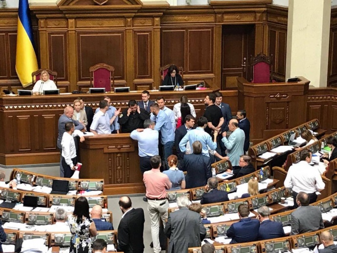 В сессионном зале Верховной Рады продолжаются споры: ряд депутатов заблокировали трибуну парламента, требуя снятия неприкосновенности.