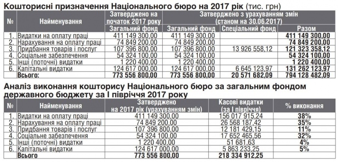 Кроме того, в сообщении отмечено, что на 2017 год с бюджета выделено 794,1 млн грн на деятельность НАБУ. За первую половину этого года бюро потратило 218,3 млн грн.