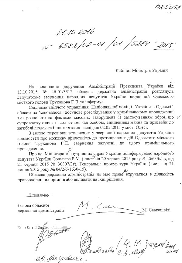 В переданном УП письме Саакашвили отчитывается перед Кабмином, который на то время возглавлял Владимир Гройсман, как ОГА рассмотрела обращение нардепа Сольвара о причастности мэра Одессы Труханова к трагедии 02.05. в Одессе.