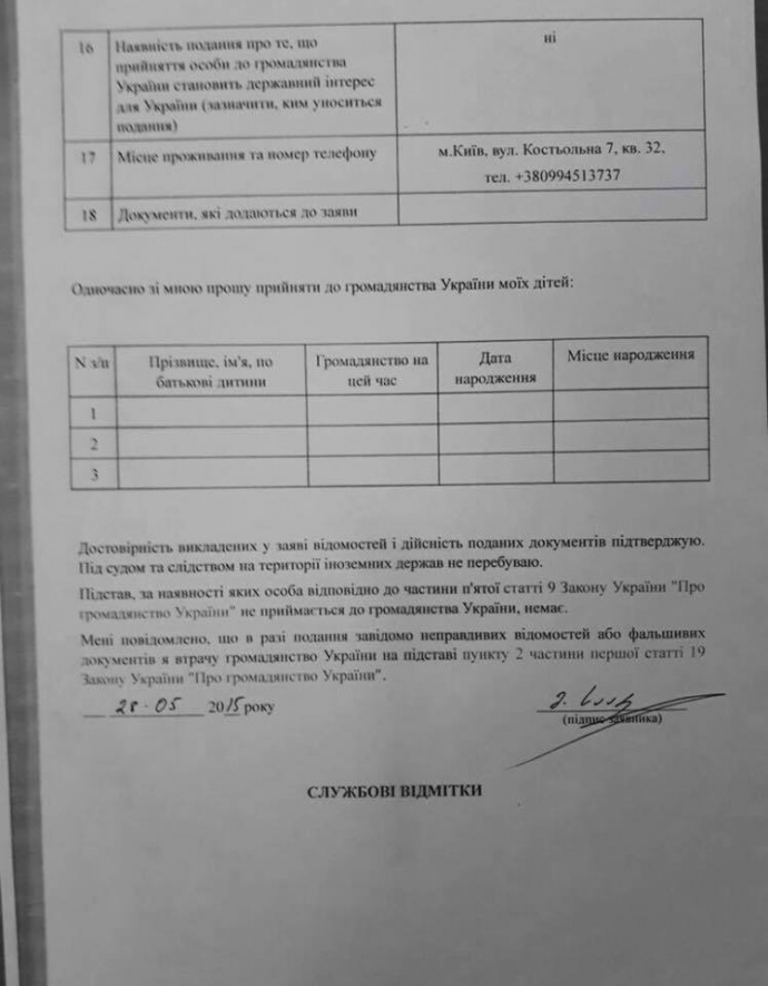 Ранее Саакашвили заявлял, что подпись в копии анкеты на получение украинского гражданства, которое было ранее опубликовано, принадлежит не ему.