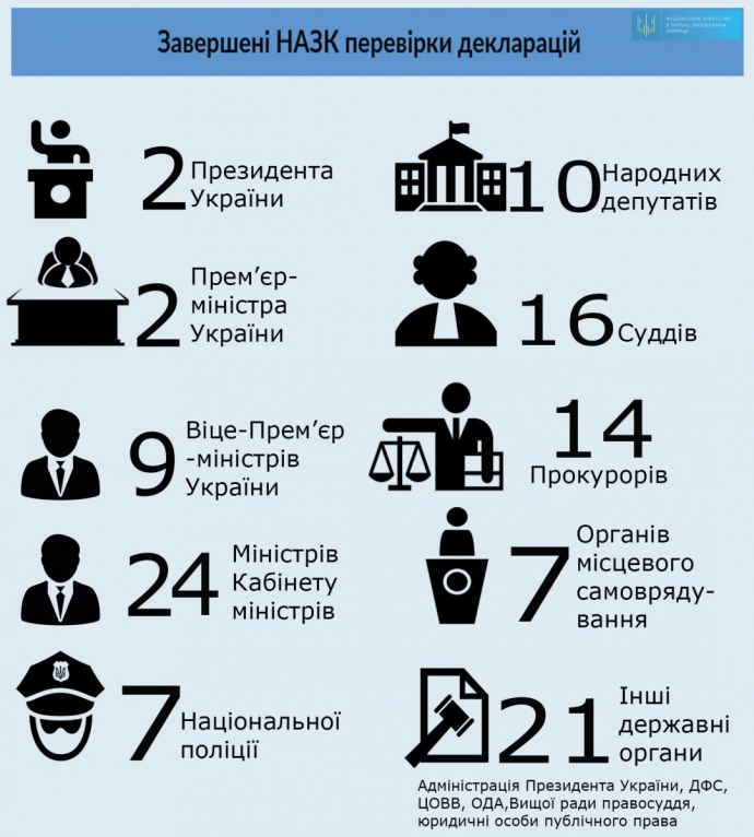 Остальные 468 проверок продолжаются. В частности, проверяют декларации народных депутатов, судей, сотрудников Национальной полиции, Государственной фискальной службы, центральных органов исполнительной власти, госадминистраций, других органов власти.