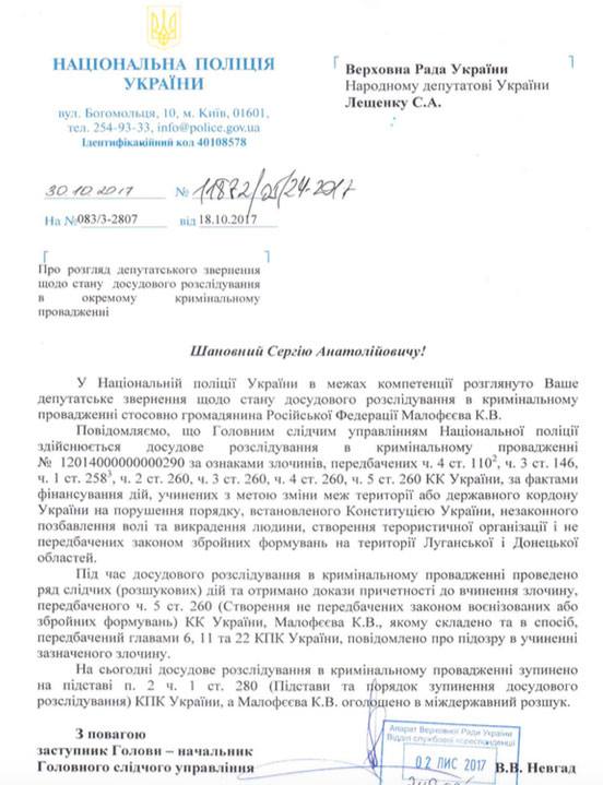 "На сегодня досудебное расследование в уголовном производстве остановлено ... а Малофеев объявлен в межгосударственный розыск", - заявили в Нацполиции.