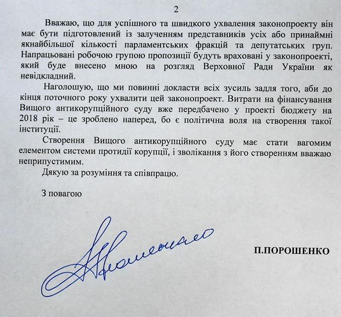 Президент направил письмо главе Верховной Рады с предложением "принять предусмотренные Регламентом меры для отзыва законопроекта №6011 "Об антикоррупционных судах", а также как можно скорее поручить главе профильного комитета создать рабочую группу по наработке соответствующего законопроекта с учетом рекомендаций Венецианской комиссии.