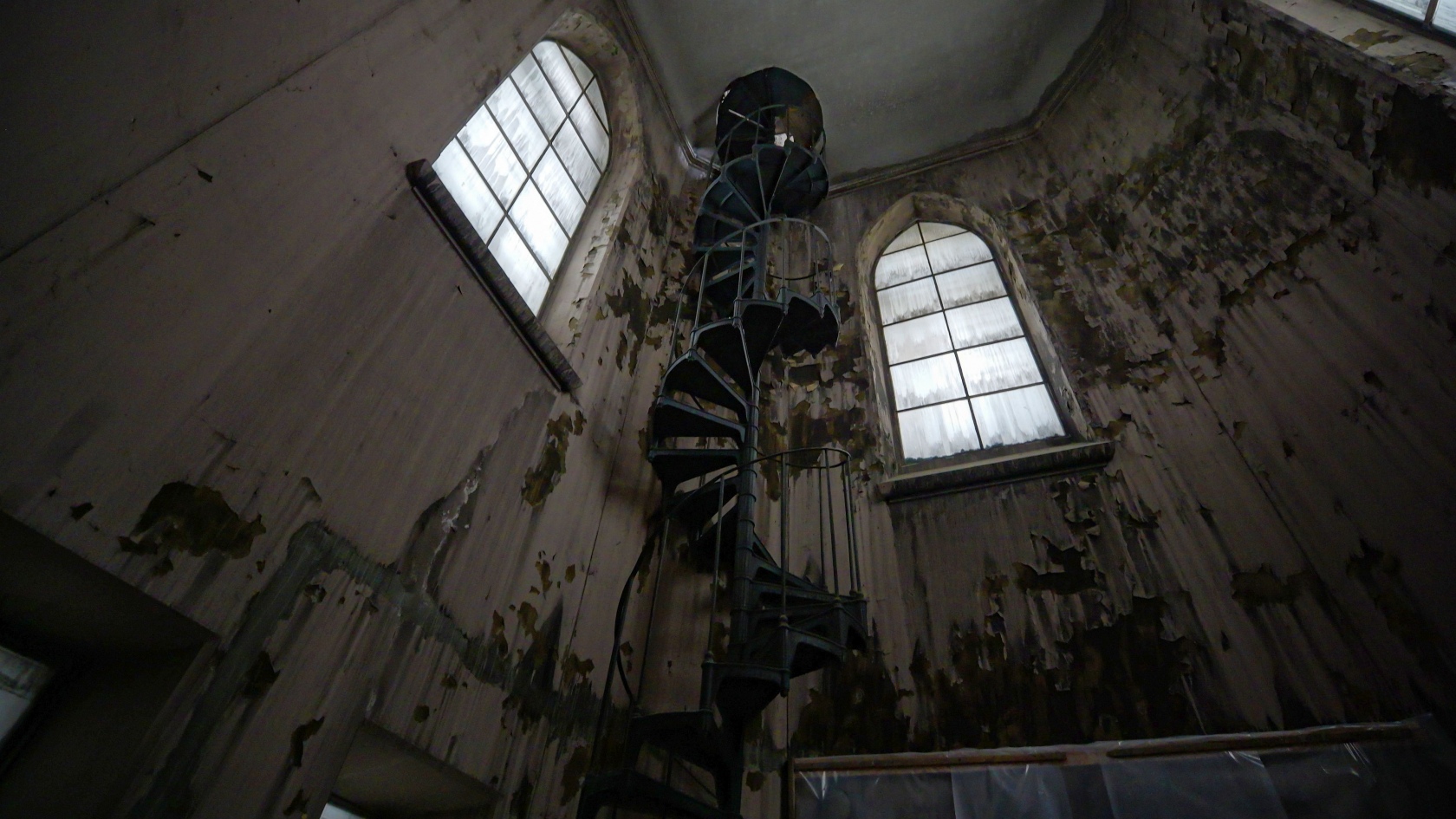 На переході з однієї башти в іншу священник вказує на дірки в покрівлі. Там, де відсутня дахівка, просочується січневе світло.